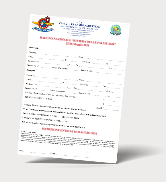 Il Vespa Club Sambenedettese e la Riviera delle Palme vi aspettano per il Raduno Nazionale di Vespe d’epoca. Con oltre 300 amanti della Vespa provenienti da tutte le città d’Italia, il raduno si terrà sabato 30 maggio e domenica 31 maggio 2026 a San Benedetto del Tronto. Scarica il modulo di iscrizione e seguici per tutte le news.